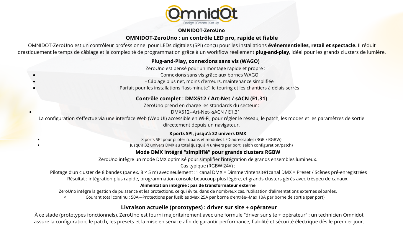 À ce stade (prototypes fonctionnels), ZeroUno est fourni majoritairement avec une formule “driver sur site + opérateur” : un technicien Omnidot assure la configuration, le patch, les presets et la mise en service afin de garantir performance, fiabilité et sécurité électrique dès le premier jour.